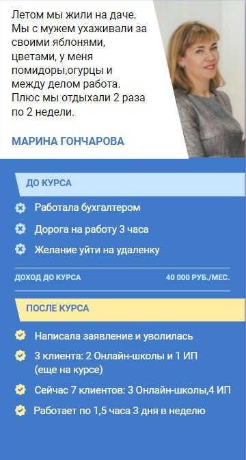 По окончании первой ступени я нашла себе фирму на HH.ru на удаленке. 10 тыс. в месяц. Наталья дает хороший пинок. Уверенность прибавилось даже не на 100%, на 1000%